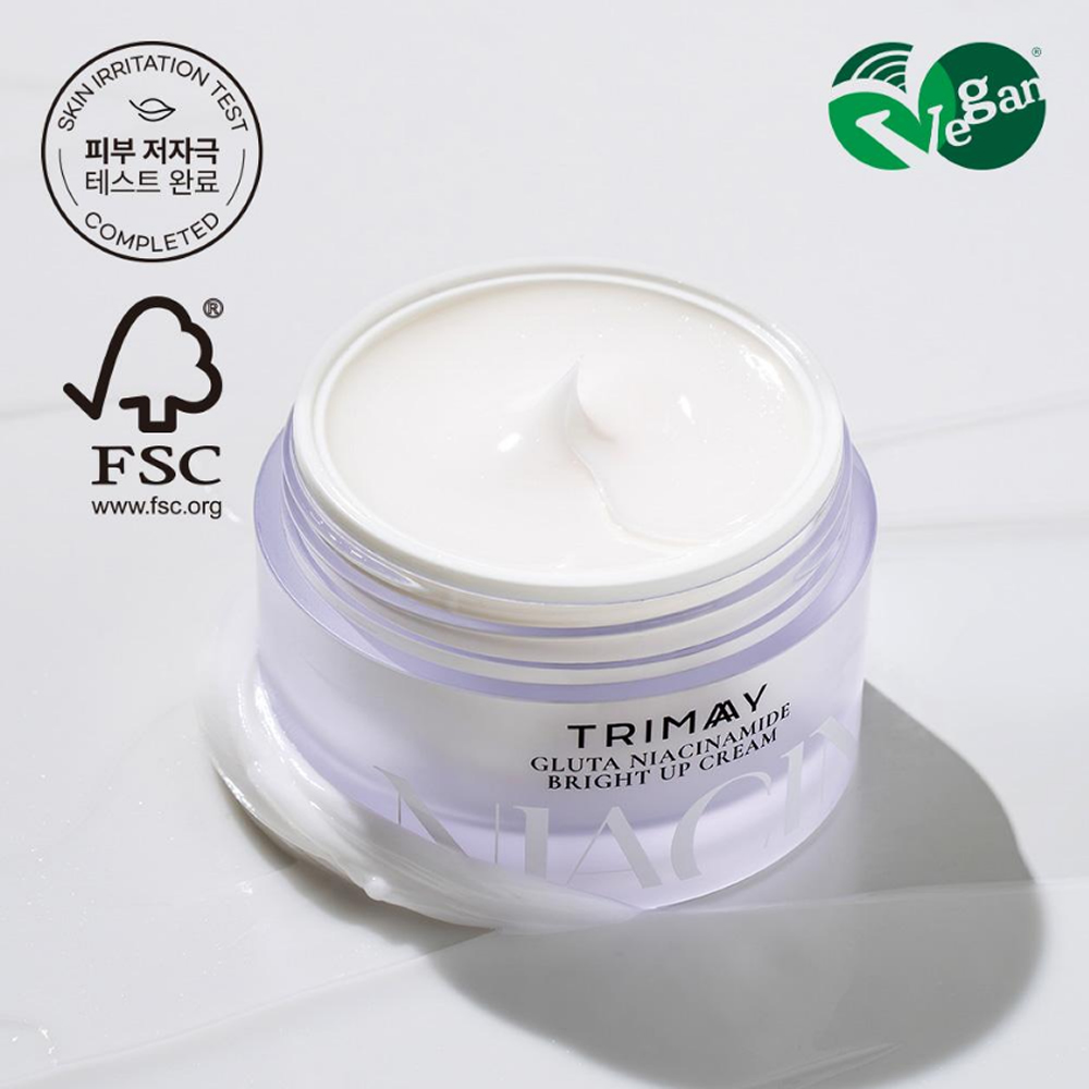O creme Trimay Gluta Niacinamide Bright Up é formulado para eliminar as imperfeições de textura, pigmentação e opacidade, além de deixar a pele purificada e brilhante. O extrato de farelo de arroz, a niacinamida e a glutationa atuam como principais ingredientes ativos da fórmula. Este trio eficaz revitaliza surpreendentemente a pele, combate a opacidade e a pigmentação e devolve um tom saudável ao rosto. Com apenas uma aplicação diária, o creme transforma visivelmente a pele e melhora o aspeto. O produto proporciona um aspeto fresco e saudável e cria o efeito de pele iluminada de dentro para fora.